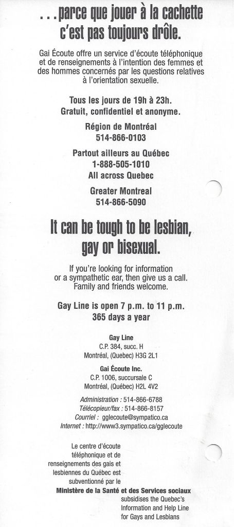 - This union with Gai Écoute allowed Gay Line to survive. Jointly, the two organisations were able to offer a bilingual service to all Quebecers via a free 1-888 number.